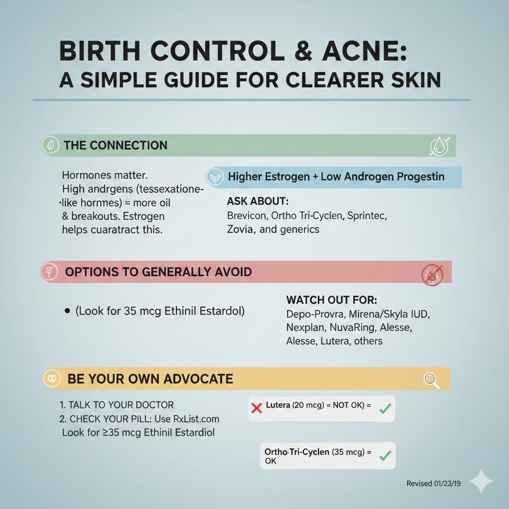 The key to clear skin lies in the balance between estrogen and progestin. Specifically, you want to watch out for the androgenic (testosterone-like) effect of your birth control. High androgen levels stimulate oil production, which leads to clogged pores and breakouts.